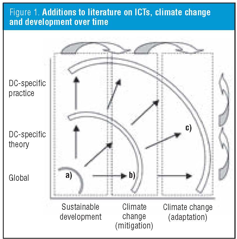 The relation between ICTs and climate change constitutes a relatively new area of enquiry. In the 1990s, there were broad reflections on the linkages between the information society and sustainable development. These became increasingly focused on the role of ICTs in climate change mitigation and monitoring, and more recently, on adaptation. In more detail, we can see three distinctive, yet interrelated strands that have so far characterised research at the intersection of ICTs, climate change and development.