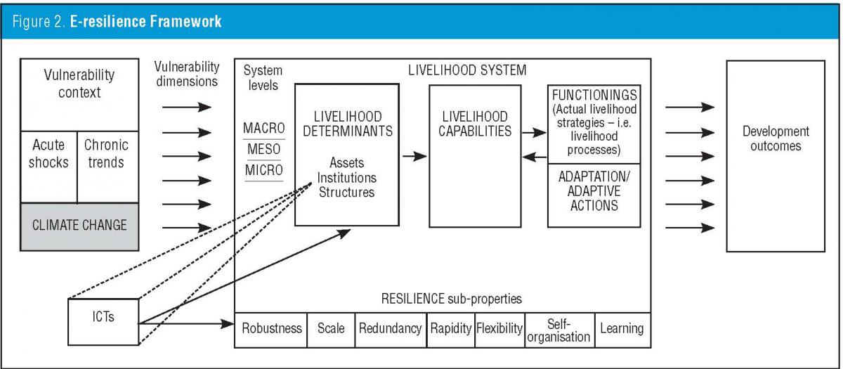 As Figure 2 illustrates, there are therefore two routes to analysing the role of ICTs vis-à-vis climate change adaptation. First, through the dynamic links of ICTs with livelihood assets, institutions and structures, in this way creating capabilities that contribute to adaptive actions. The second, less-explored route, focuses on “eresilience”: “a property of livelihood systems by which ICTs interact with a set of resilience sub-properties, enabling the system to adapt to the effects of climate change.” 9