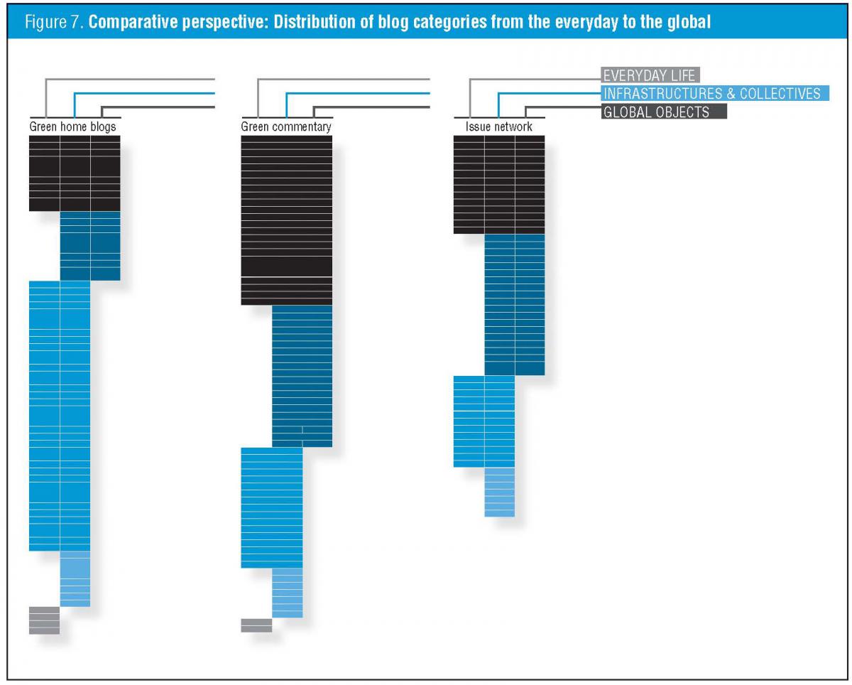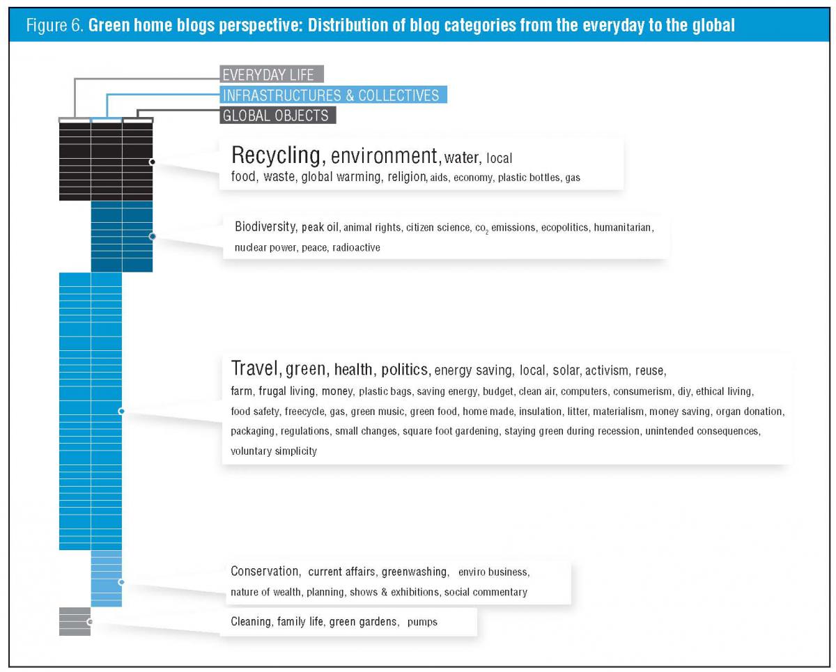 Perhaps unsurprisingly, the more informal and “homey” green home blogs tend towards the everyday. However, possibly more surprisingly, it is not the more institutionally oriented green issue network that is most concerned with global issues, but rather critical commentary sites. And significantly, while the issue network is much concerned with consumption, it includes no issue terms that can be considered exclusive to everyday life.