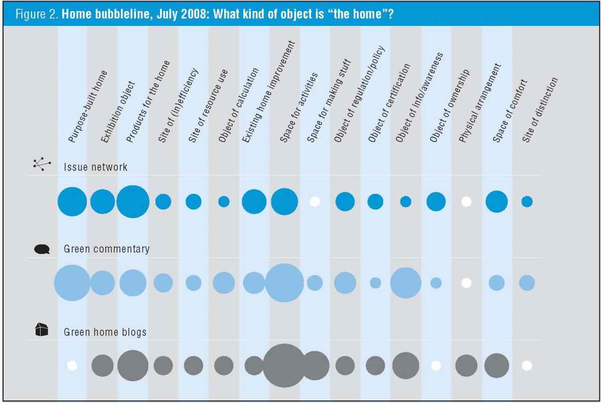 Our initial typology of the green home brings into view a number of differences and similarities among the three source sets or spheres. For instance, the more “institutional” issue network focuses on new and purpose-built homes and products, while on the more informal blogs, the home figures especially prominently as an activity space. Secondly, we note that the home does figure as a space of calculation in all three spaces, both in the narrow sense (a focus on calculating the carbon output associated with individuals, activities and settings), as well as in the broader sense (a preoccupation with resource efficiency). In this respect, the significant divergence between the source sets does not centre on how “calculative” they are in their approach of sustainable housing, but rather on the kinds of homes and objects they foreground: new builds versus existing homes, and domestic products versus domestic activities. We speculate that different types of sustainable homes may instantiate different foci of environmental action: innovation versus renovation; buying versus doing. If so, this also raises particular questions about public engagement: is it oriented towards the future (new builds) or situated in current locations (existing homes)? Is it enacted through consumption or through the informal activities associated with the domestic sphere?
